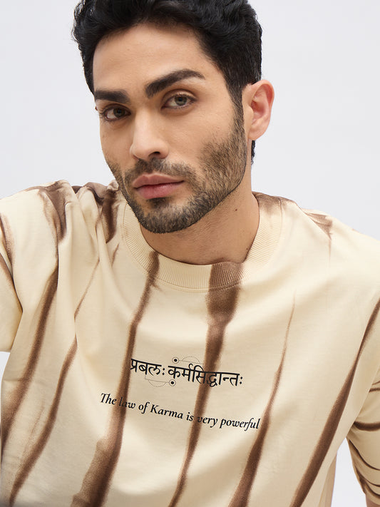 Beige Spray Print T-Shirt – "प्रबलः कर्मसिद्धान्तः" (The Law of Karma is Powerful)