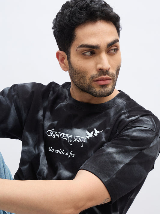 Black Spray Print Oversized T-Shirt – "अनुगच्छतु प्रवाहं" | Go with the Flow