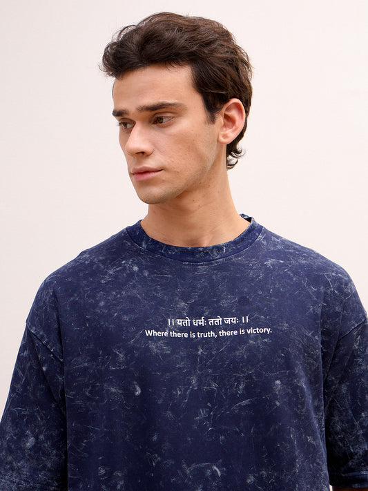 Indigo Blue Acid Wash Oversized T-Shirt - "।। यतो धर्मः ततो जयः ।।" Sanskrit quotes